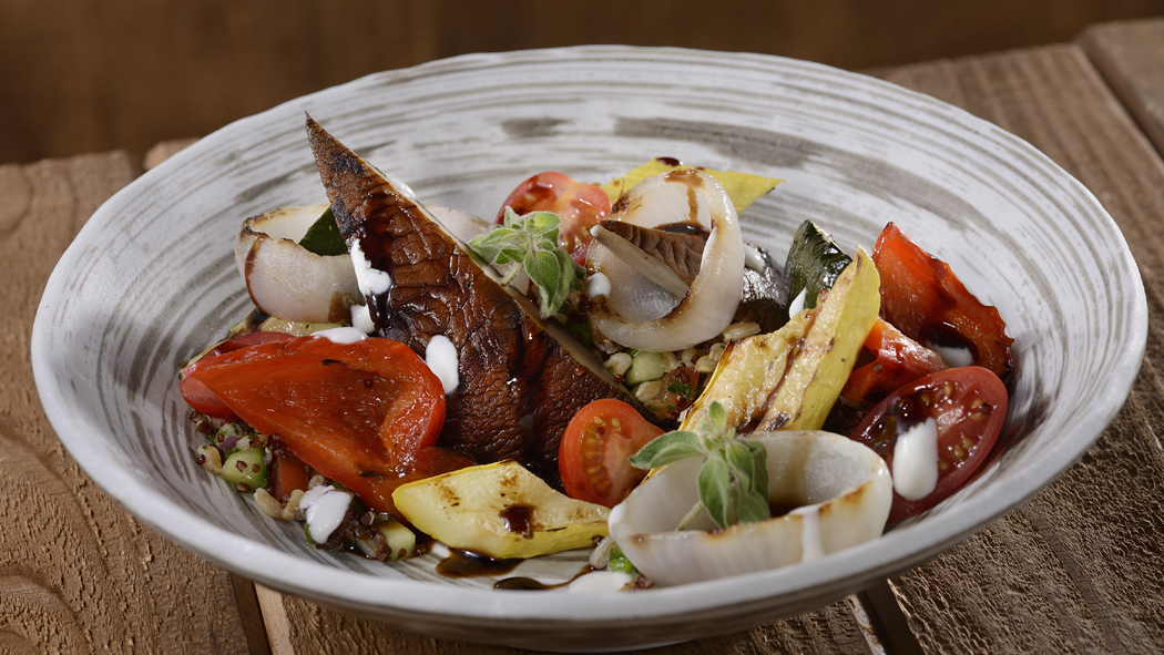 - Salad with grilled Portobello, zucchini, roasted red peppers, tomato and multi-grain salad with goat cheese dressing
